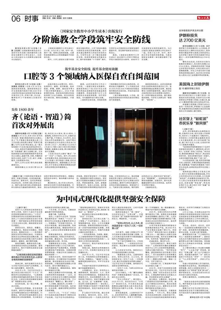- 为中国式现代化提供坚强安全保障 ■ 新华社记者 国之大者,安全为要。 今年4月15日是第十一个全民国家安全教育日。连日来,各地各部门以总体国家安全观为指导,通过丰富多彩的形式和活动提升全民国家安全意识,筑