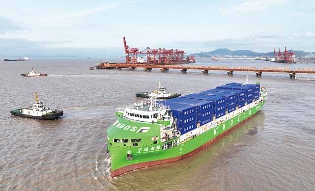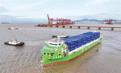 4月15日,全球最大、国内首艘万吨级纯电动智能集装箱海船“宁远电鲲”轮从宁波舟山港北仑港区启航,驶向嘉兴港乍浦港区,标志着该船正式投入商业航线运营。新华社发