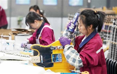 近年来,山东潍坊昌乐县鄌郚镇乐器生产企业积极拓展海外电吉他市场,该镇生产的电吉他远销130多个国家和地区。鄌郚镇聚集了乐器生产和配套企业100多家,年产约200万把吉他、500万套配件,是远近闻名的“吉他小镇”。新华社发