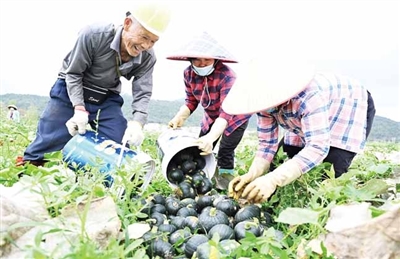 贝贝南瓜基地在整地、育苗、管护、采收等环节为本地村民提供了多个灵活务工岗位,采收期每天务工人员达100多人,实现了群众“家门口就业”。“来这里干活,每天工作8小时,能挣150元,还能兼顾家里的事,挺合适的。”正在搬运南瓜的村民冯伯笑着说道。