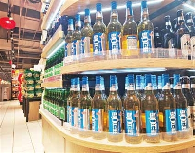 4月18日,记者来到市区盈信广场的昌大昌超市,啤酒区内各类品牌、款式的啤酒琳琅满目。其中一款“珠江0度”玻璃瓶装啤酒被放置在货架中间显眼位置,瓶身正面未标注明显的“含酒精”提示,仅在瓶口处印有“冰点酿造”字样。记者仔细查看配料表发现,该款啤酒酒精度≥3.6%vol,与市面上普通啤酒的酒精含量基本持平。
