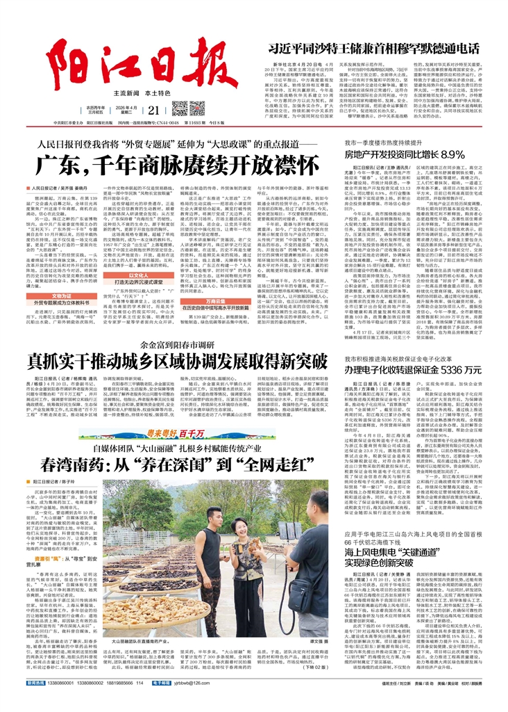 - 真抓实干推动城乡区域协调发展取得新突破 阳江日报讯(记者/杨辉南 通讯员/杨综)4月20日,市委副书记、市长余金富到阳春市调研养老服务突出问题专项整治和“百千万工程”,并开展巡河工作,强调要牢固树立和践行正确政绩观,统筹做好民生保障、生