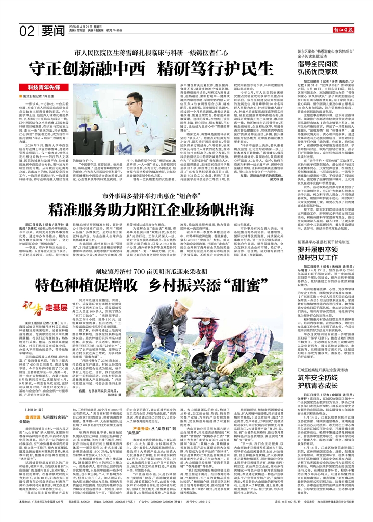 - 精准服务助力阳江企业扬帆出海 阳江日报讯(记者/陈子玲 通讯员/关伟欣)记者从市外事局获悉,今年以来,该局充分发挥外事资源优势,通过举办专场推介、靶向走访及惠企座谈等“组合拳”,全力护航阳江企业“扬帆出海”。 一季度,市外