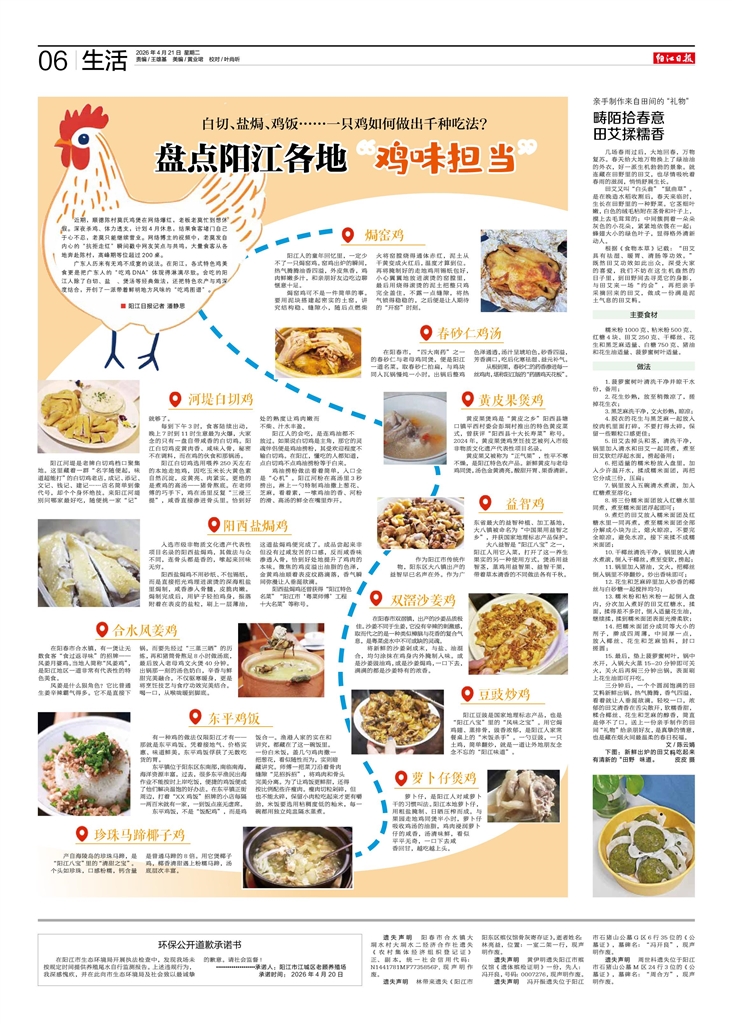 - 盘点阳江各地“鸡味担当” 近期,顺德陈村莫氏鸡煲在网络爆红,老板老莫忙到想休假。深夜杀鸡、体力透支,计划4月休息,结果食客堵门自己于心不忍,老莫只能继续营业。网络博主的视频中,老莫发自内心的“抗拒走红”瞬间戳中网友笑点与共