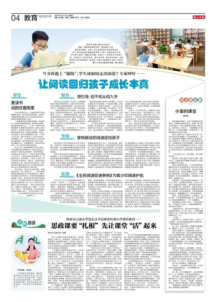 - 让阅读回归孩子成长本真 阅读不仅能丰富学生的知识储备,更能滋养精神世界、塑造健全人格、提升综合素养。当前,阳江各学段学生的阅读现状如何?他们在阅读中面临哪些困惑?学校、家庭应如何引导学生爱上阅读?带着这些问题,在第31个