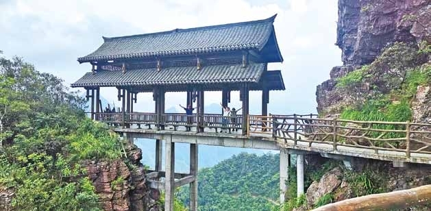 拍完照片,我们在悬崖峭壁上拾级攀爬,一峰越过一峰,峰峰观景不同。这边群峰连绵不绝,漫山碧绿绵长,杜鹃灿烂;另一边又或是奇峰突兀,不止气势磅礴,更是险象环生,喀斯特地貌交错发育。险峻处固然惊心动魄,而峰回路转间,忽见一桥飞架,连接两峰,又添几分婉约之致。八角亭阁更是绵延数公里林立,是一种遥遥相望相守却各自美丽独立的景致。站在亭角或观景台上,对面风景都是一幅绵长明艳的画卷。