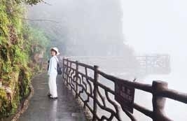下了缆车,踏上悬空栈道,顿觉身在云端,脚下深谷望不见底。身旁,云雾缭绕,六七步之外之人已看不清。周边一切事物皆隐隐约约,朦朦胧胧,对面的来人仿佛从梦中飘出,稍不留神,就互相撞个满怀。